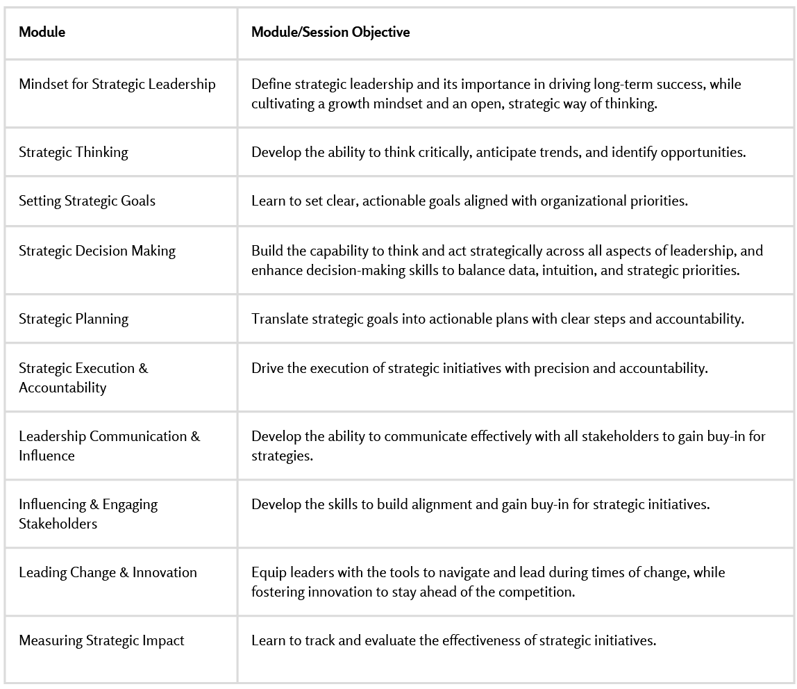 The Strategic Leadership Development Coaching Program is designed to help leaders enhance their strategic thinking, planning, and execution skills. The program integrates foundational knowledge, practical tools, and reflective practices to enable leaders to drive meaningful results and lead with purpose.